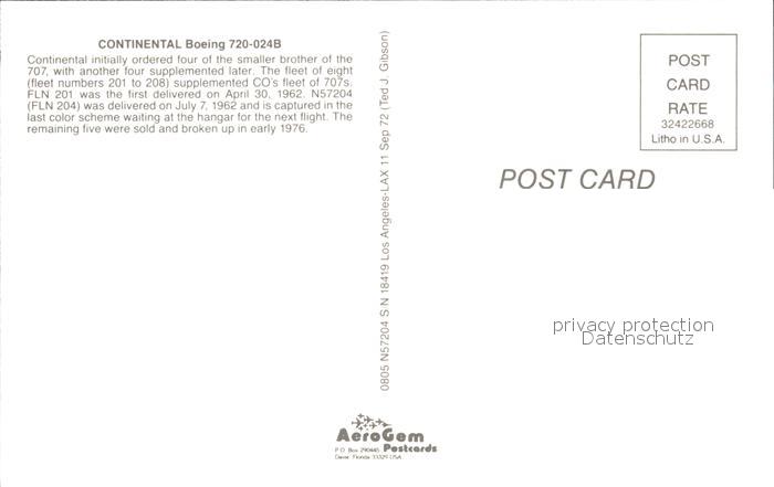 Flugzeuge Zivil Continental Boeing 720-024B N57204 S/N 18419 postalisch nicht gelaufen Erhaltung siehe scans