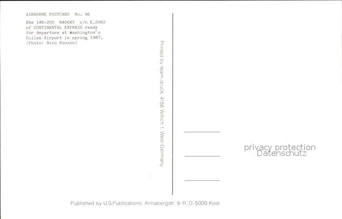 Flugzeuge Zivil Continental Express BAe 146-200 N406XV c/n E.2062 postalisch nicht gelaufen Erhaltung siehe scans