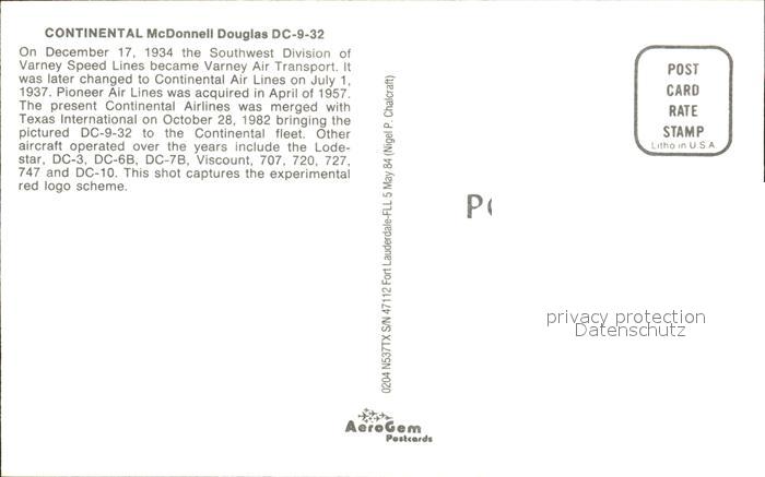 Flugzeuge Zivil Continental McDonnell Douglas DC-9-32 postalisch nicht gelaufen Erhaltung siehe scans