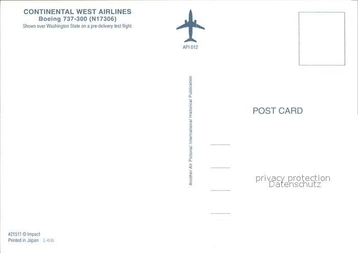Flugzeuge Zivil Continental West Airlines Boeing 737-300 N17306 postalisch nicht gelaufen Erhaltung siehe scans