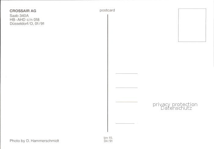 Flugzeuge Zivil Crossair Saab 340A HB-AHD c/n 018 postalisch nicht gelaufen Erhaltung siehe scans