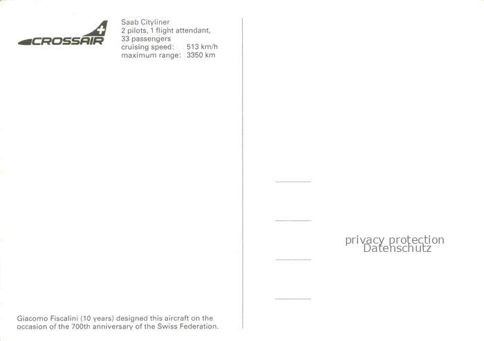 74023568 Flugzeuge Zivil Crossair Saab Cityliner HB AHD postalisch nicht gelaufen Erhaltung siehe scans [IrynaD87] KatCode: 22120000001300