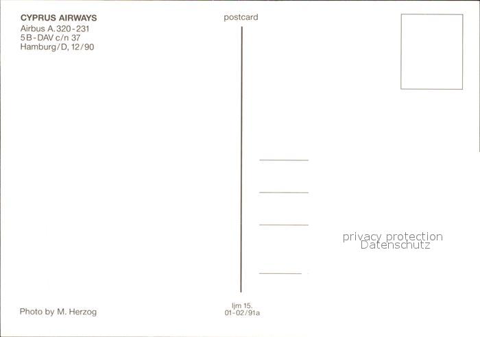 Flugzeuge Zivil Cyprus Airways A320-231 5B-DAV c/n 37 postalisch nicht gelaufen Erhaltung siehe scans