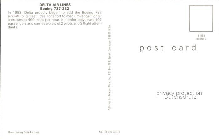 Flugzeuge Zivil Delta Air Lines Boeing 737-232 postalisch nicht gelaufen Erhaltung siehe scans