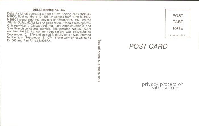 Flugzeuge Zivil Delta Boeing 747-132 N9896 postalisch nicht gelaufen Erhaltung siehe scans