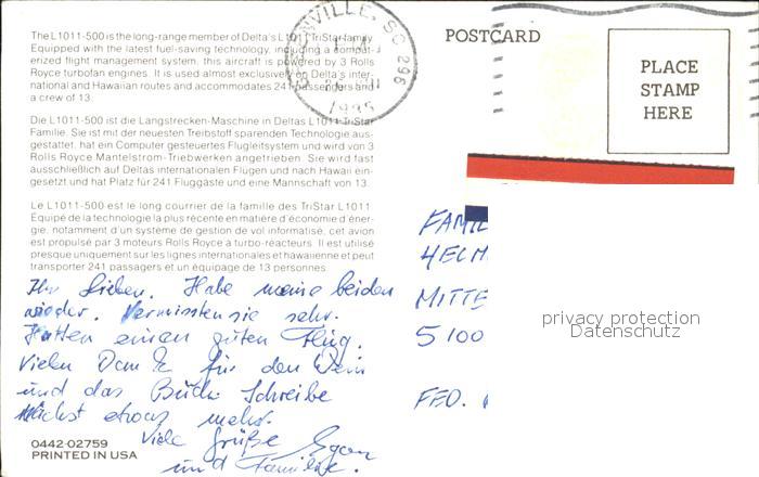 alte Postkarte Flugzeuge Zivil Delta L1011-500 postalisch gelaufen Erhaltung siehe scans