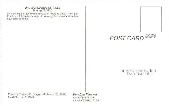 Flugzeuge Zivil DHL Worldwide Express Boeing 727-22C N726PL c/n 19192 postalisch nicht gelaufen Erhaltung siehe scans