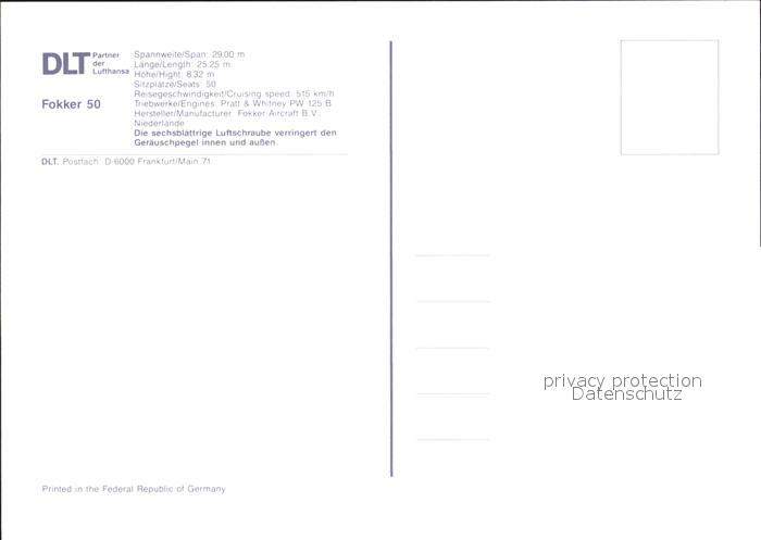 Flugzeuge Zivil DLT Fokker 50 postalisch nicht gelaufen Erhaltung siehe scans