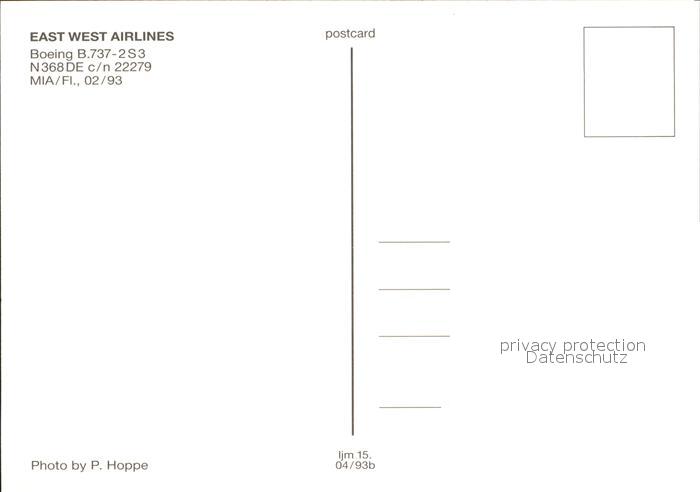 Flugzeuge Zivil East West Airlines Boeing 737-2S3 N368DE c/n 22279 postalisch nicht gelaufen Erhaltung siehe scans