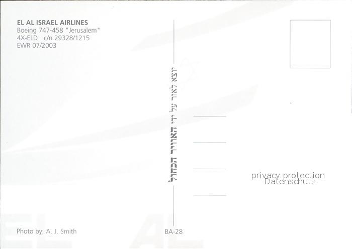 Flugzeuge Zivil El Al Israel Airlines Boeing 747-458 Jerusalem 4X-ELD c/n 29328/1215 postalisch nicht gelaufen Erhaltung siehe scans
