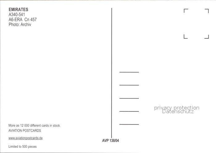 Flugzeuge Zivil EMIRATES A340-541 A6-ERA cn 457 postalisch nicht gelaufen Erhaltung siehe scans