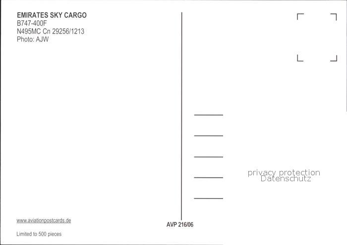 Flugzeuge Zivil Emirates Sky Cargo B747-400F N495MC Cn 29256/1213 postalisch nicht gelaufen Erhaltung siehe scans