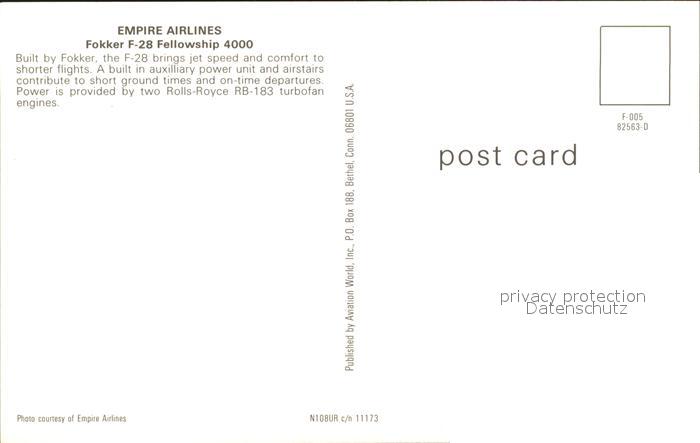 Flugzeuge Zivil Empire Airlines Fokker F-28 Fellowship 4000 N108UR c/n 11173 postalisch nicht gelaufen Erhaltung siehe scans