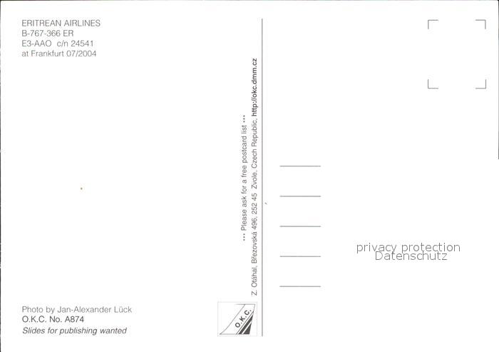 Flugzeuge Zivil Eritrean Airlines B-767-366ER E3-AAO c/n 24541 postalisch nicht gelaufen Erhaltung siehe scans