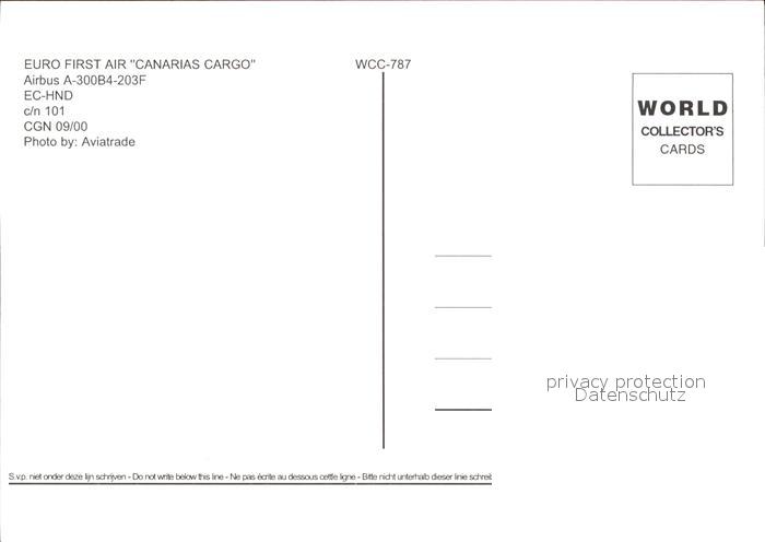 Flugzeuge Zivil Euro First Air Canarias Cargo Airbus A-300B4-203F EC-HND c/n 101 postalisch nicht gelaufen Erhaltung siehe scans
