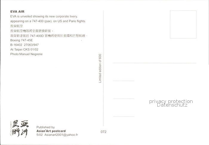 Flugzeuge Zivil Eva Air B747-45E B-16402 27064/947 postalisch nicht gelaufen