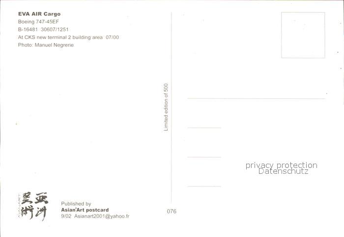Flugzeuge Zivil Eva Air Cargo Boeing 747-45EF B-16481 30607/1251 postalisch nicht gelaufen Erhaltung siehe scans