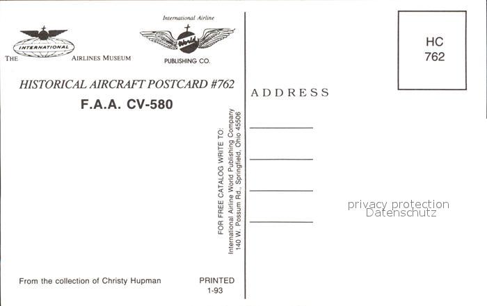 Flugzeuge Zivil F.A.A CV-580 N92 postalisch nicht gelaufen Erhaltung siehe scans