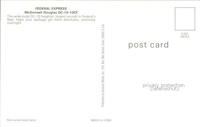 Flugzeuge Zivil Federal Express McDonnell Douglas DC-10-10CF N68055 c/n 47809 postalisch nicht gelaufen Erhaltung siehe scans