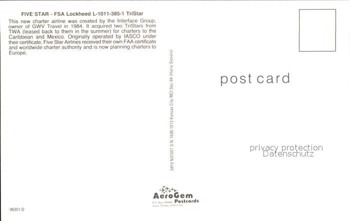 Flugzeuge Zivil Five Star-FSA Lockheed L-1011-385-1 TriStar N21301 S/N 193B-1013 postalisch nicht gelaufen Erhaltung siehe scans