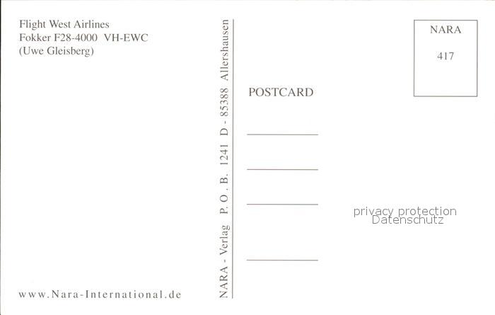 Flugzeuge Zivil Flight West Airlines Fokker F28-4000 VH-EWC postalisch nicht gelaufen Erhaltung siehe scans