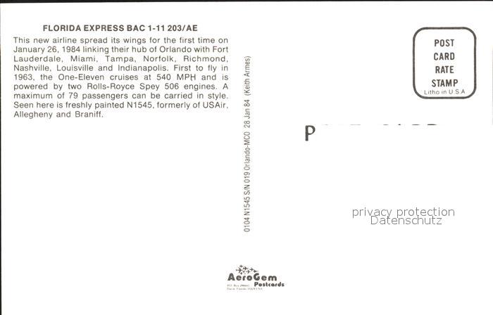 Flugzeuge Zivil Florida Express BAC 1-11 203/AE postalisch nicht gelaufen Erhaltung siehe scans