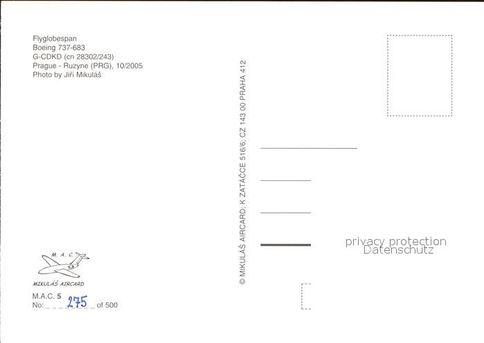 Flugzeuge Zivil Flyglobespan Boeing 737-683 G-CDKD cn 28302/243 postalisch nicht gelaufen Erhaltung siehe scans