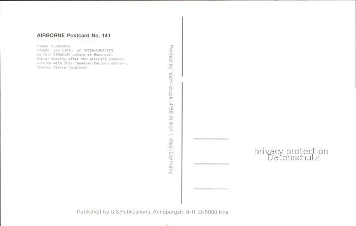 Flugzeuge Zivil Fokker F.28-1000 C-GQBS c/n 11013 Inter-Canadian postalisch nicht gelaufen