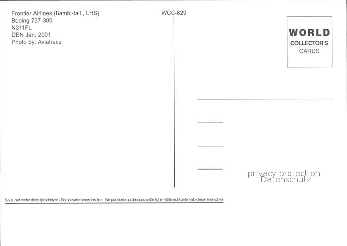 Flugzeuge Zivil Frontier Airlines Bambi Tail Boeing 737-300 N311FL postalisch nicht gelaufen Erhaltung siehe scans