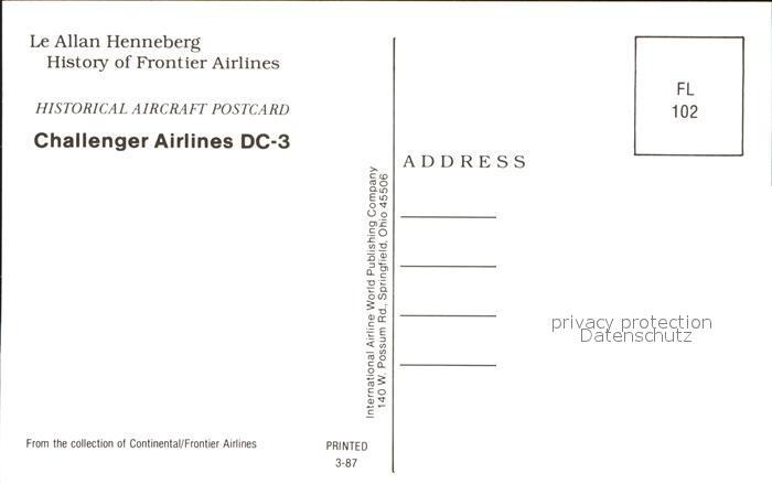 Flugzeuge Zivil Frontier Airlines Challenger Airlines DC-3 postalisch nicht gelaufen Erhaltung siehe scans