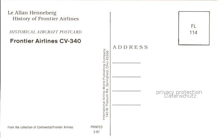Flugzeuge Zivil Frontier Airlines CV-340 Sunliner Navajo N73130 postalisch nicht gelaufen Erhaltung siehe scans