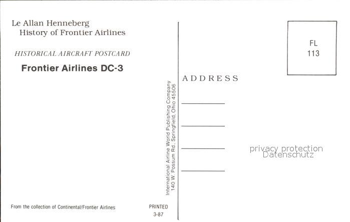 Flugzeuge Zivil Frontier Airlines DC-3 postalisch nicht gelaufen Erhaltung siehe scans