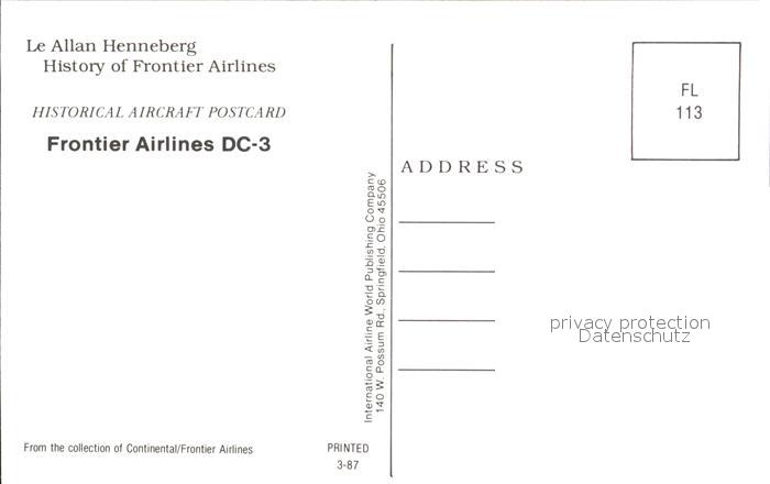 Flugzeuge Zivil Frontier Airlines DC-3 postalisch nicht gelaufen Erhaltung siehe scans