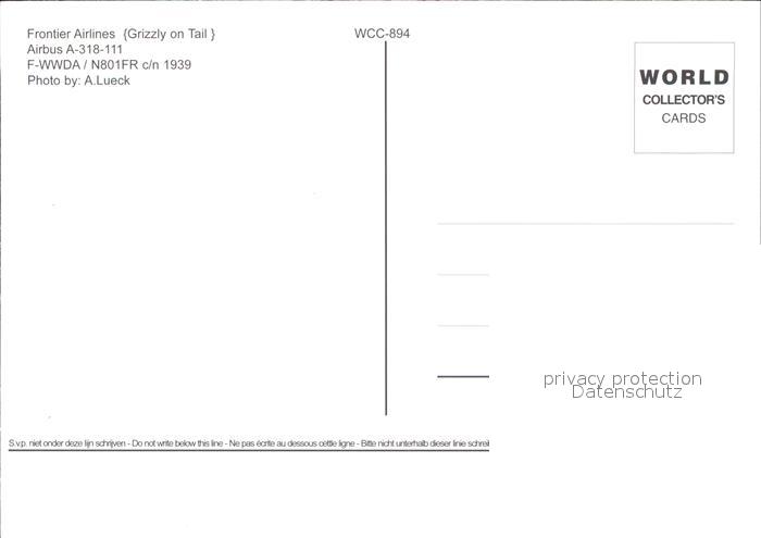 Flugzeuge Zivil Frontier Airlines Grizzly on Tail A318-111 F-WWDA N801FR c/n 1939 postalisch nicht gelaufen