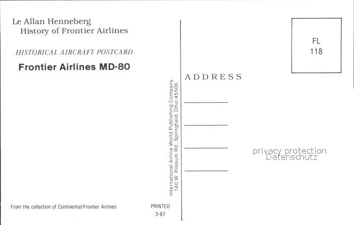 Flugzeuge Zivil Frontier Airlines MD-80 postalisch nicht gelaufen Erhaltung siehe scans
