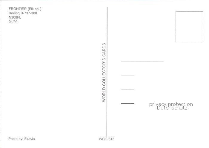 Flugzeuge Zivil Frontier Elk colours Boeing 737-300 N308FL postalisch nicht gelaufen Erhaltung siehe scans