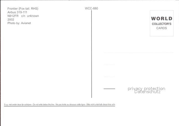 Flugzeuge Zivil Frontier (fox tail. RHS) Airbus 319-111 N912FR postalisch nicht gelaufen Erhaltung siehe scans