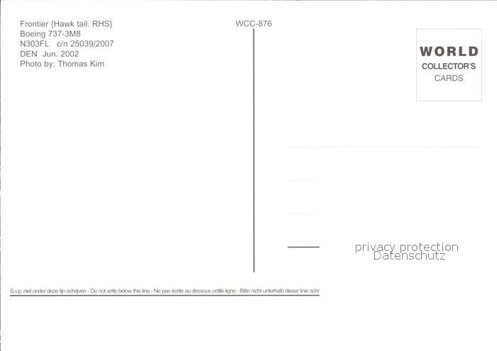 Flugzeuge Zivil frontier (Hawk tail. RHS) boeing 737-3MB N303FL c/n 25039/2007 postalisch nicht gelaufen Erhaltung siehe scans