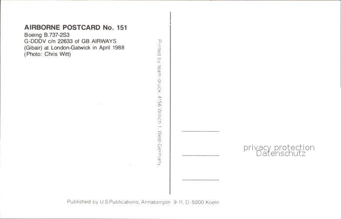 Flugzeuge Zivil GB Airways Boeing B-737-2S3 G-DDDV c/n 22633 postalisch nicht gelaufen Erhaltung siehe scans