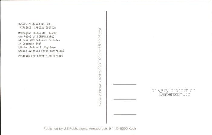 Flugzeuge Zivil German Cargo McDouglas DC-8-73AF D-ADUO c/n 46047 postalisch nicht gelaufen Erhaltung siehe scans