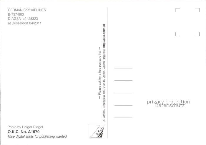 Flugzeuge Zivil German Sky Airlines B-737-883 D-AGSA c/n 28323 postalisch nicht gelaufen Erhaltung siehe scans