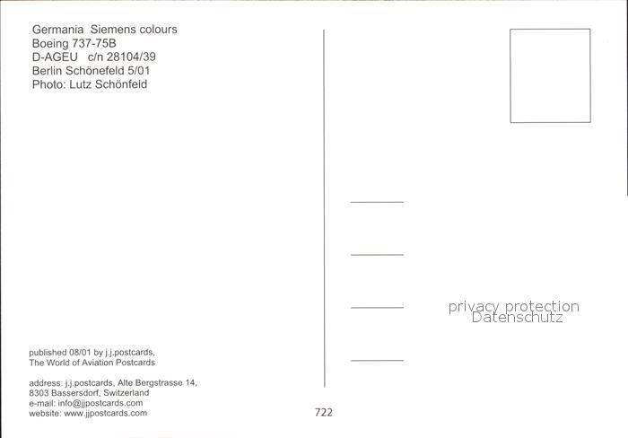 Flugzeuge Zivil Germania Siemens colours Boeing 737-75B D-AGEU c/n 28104/39 postalisch nicht gelaufen Erhaltung siehe scans