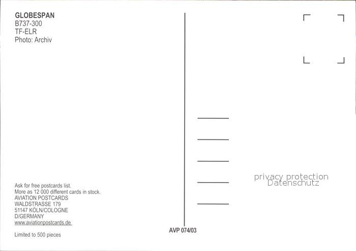 Flugzeuge Zivil Globespan B737-300 TF-ELR postalisch nicht gelaufen Erhaltung siehe scans