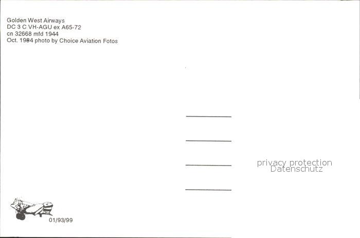 Flugzeuge Zivil Golden West Airways DC-3-C VH-AGU ex A65-72 cn 32668 mfd 1944 postalisch nicht gelaufen Erhaltung siehe scans
