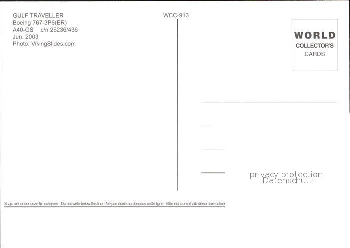 Flugzeuge Zivil Gulf Traveller Boeing 767-3P6 ER A40-GS c/n 26236/436 postalisch nicht gelaufen Erhaltung siehe scans