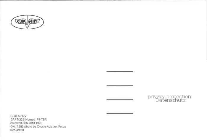Flugzeuge Zivil Gum Air NV GAF N22B Nomad PZ-TBA cn N22B-066 postalisch nicht gelaufen Erhaltung siehe scans