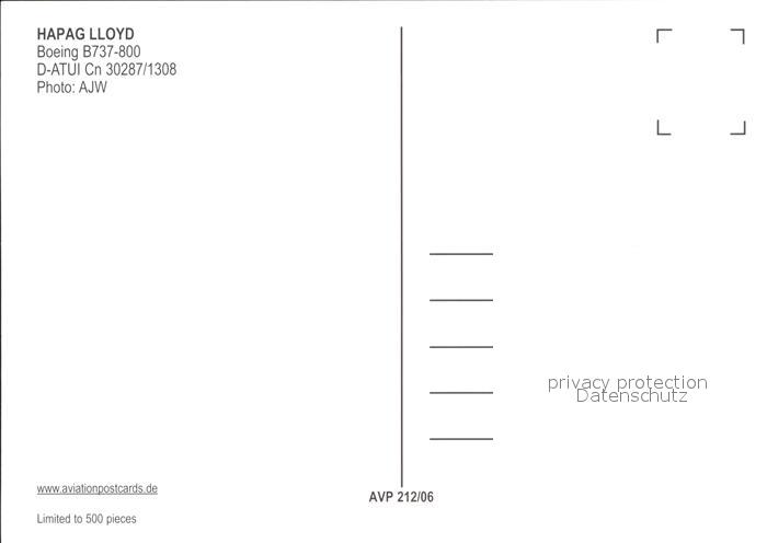 Flugzeuge Zivil Hapag Lloyd Boeing 737-800 D-ATUI Cn 30287/1308 postalisch nicht gelaufen Erhaltung siehe scans