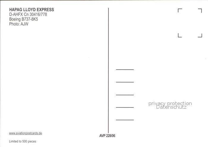 Flugzeuge Zivil Hapag Lloyd Express Boeing 737-8K5 D-AHFX Cn 30416/778 postalisch nicht gelaufen Erhaltung siehe scans