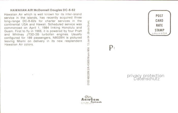 Flugzeuge Zivil Hawaiian Air McDonnell Douglas DC-8-62 N802BN postalisch nicht gelaufen