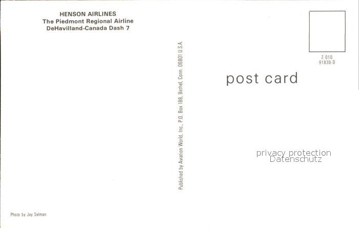 Flugzeuge Zivil Henson Airlines Piedmont Regional Airline DeHavilland-Canada Dash 7 postalisch nicht gelaufen Erhaltung siehe scans